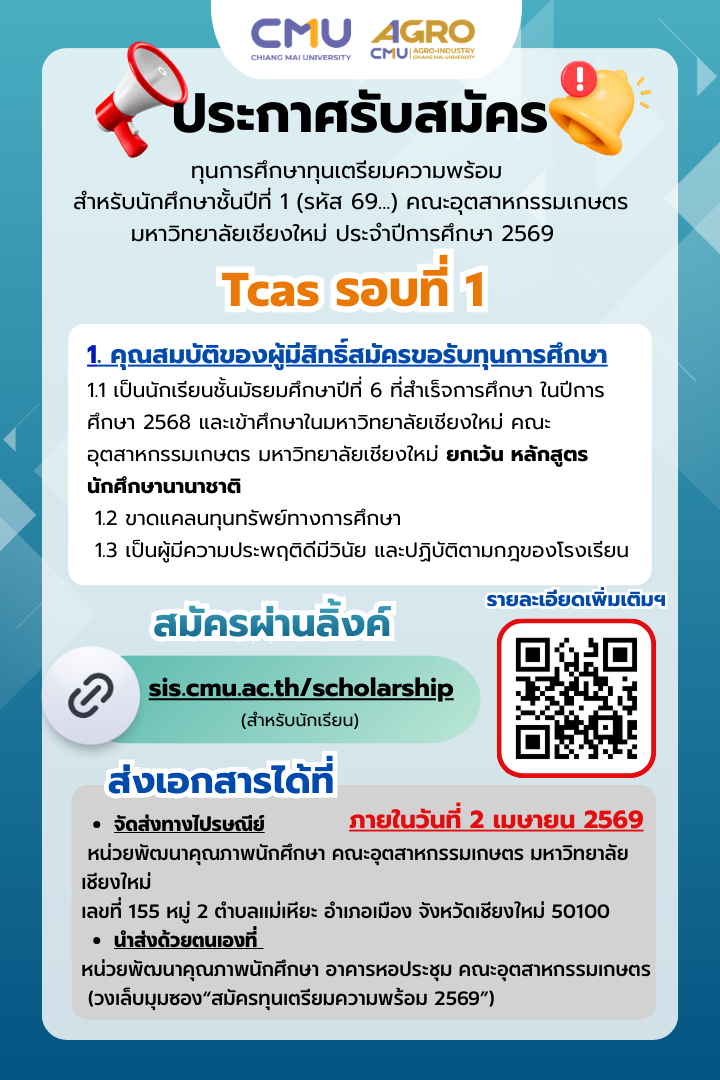 1.1 เป็นนักเรียนชั้นมัธยมศึกษาปีที่ 6 ที่สําเร็จการศึกษา ในปีการศึกษา 2568 และเข้าศึกษาในคณะอุตสาหกรรมเกษตร มหาวิทยาลัยเชียงใหม่